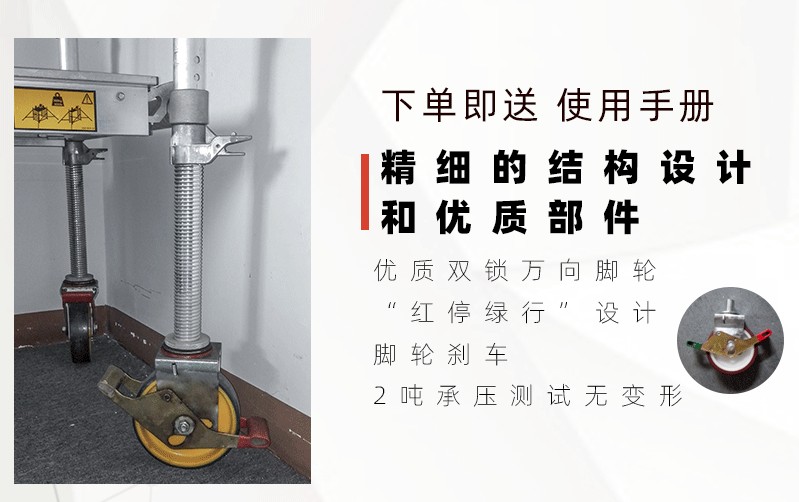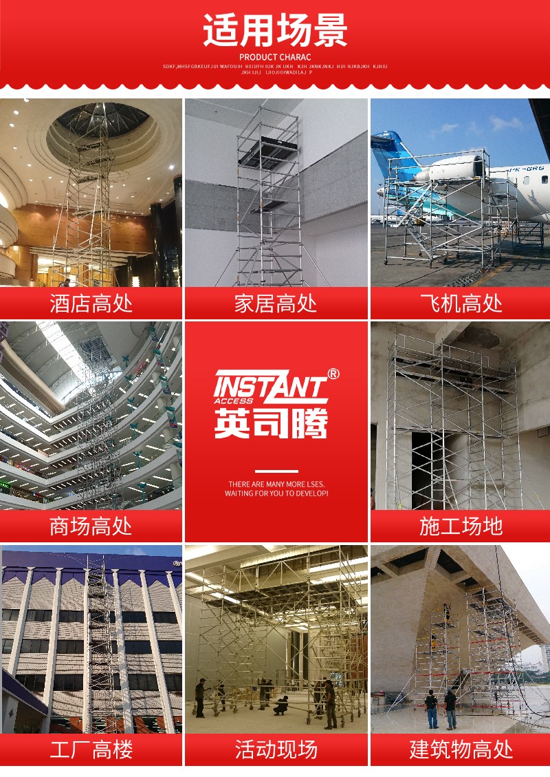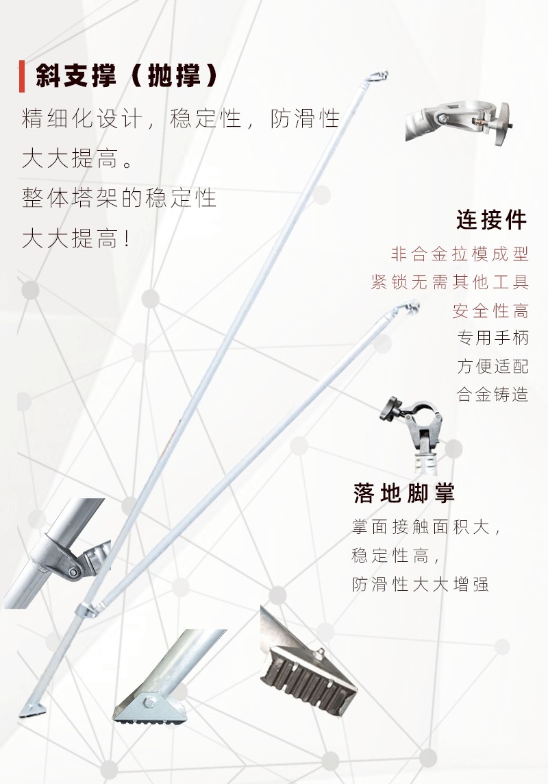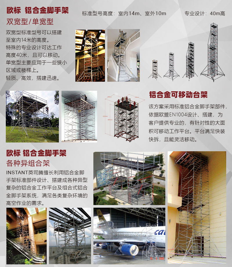 该系列产品是针对中国建筑业市场特殊情况(工人普遍不爱惜工器具、使用水平低等特点)而设计,采用强大而牢固的50.8mm直径、1.5-3.0mm壁厚的6082-T6航空铝合金管,主体框架采用机器