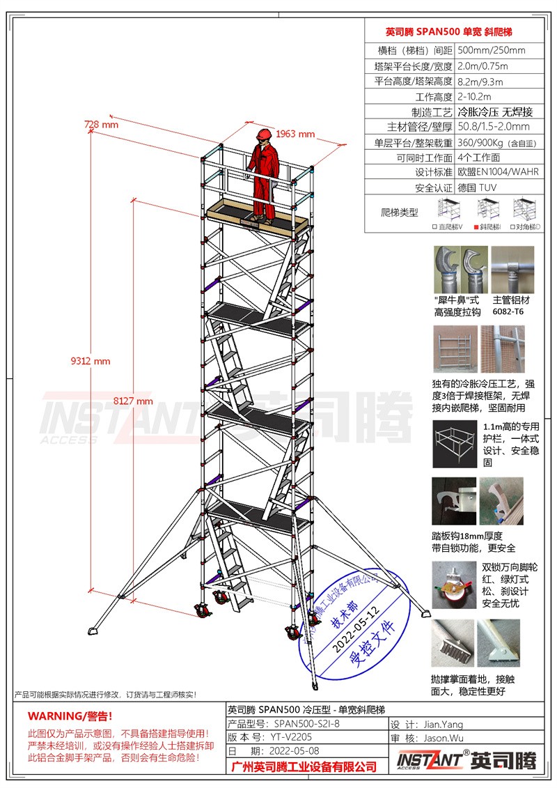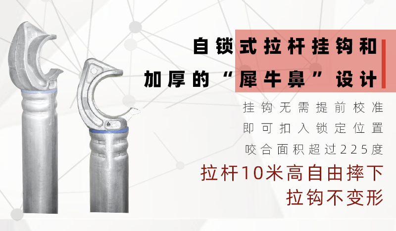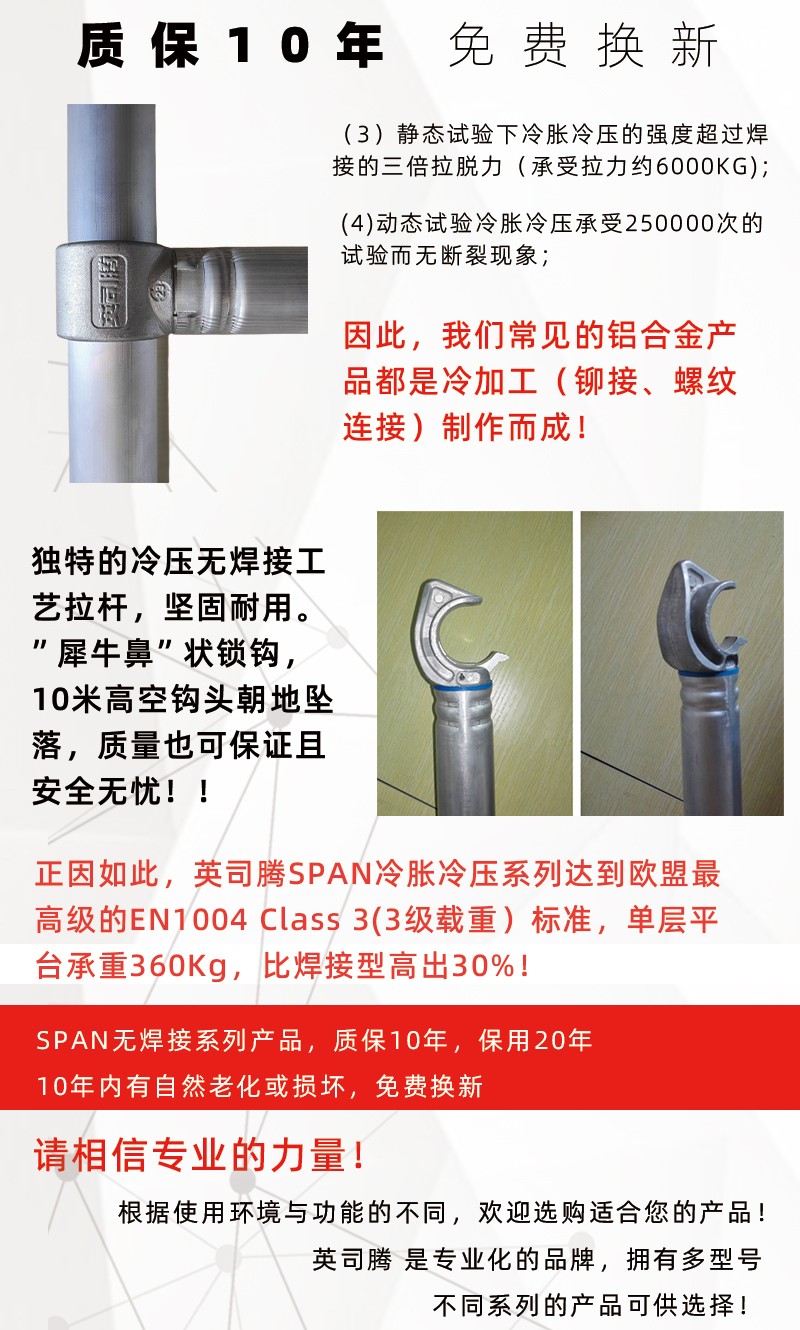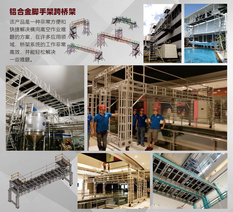 该系列产品是针对中国建筑业市场特殊情况(工人普遍不爱惜工器具、使用水平低等特点)而设计,采用强大而牢固的50.8mm直径、1.5-3.0mm壁厚的6082-T6航空铝合金管,主体框架采用机器